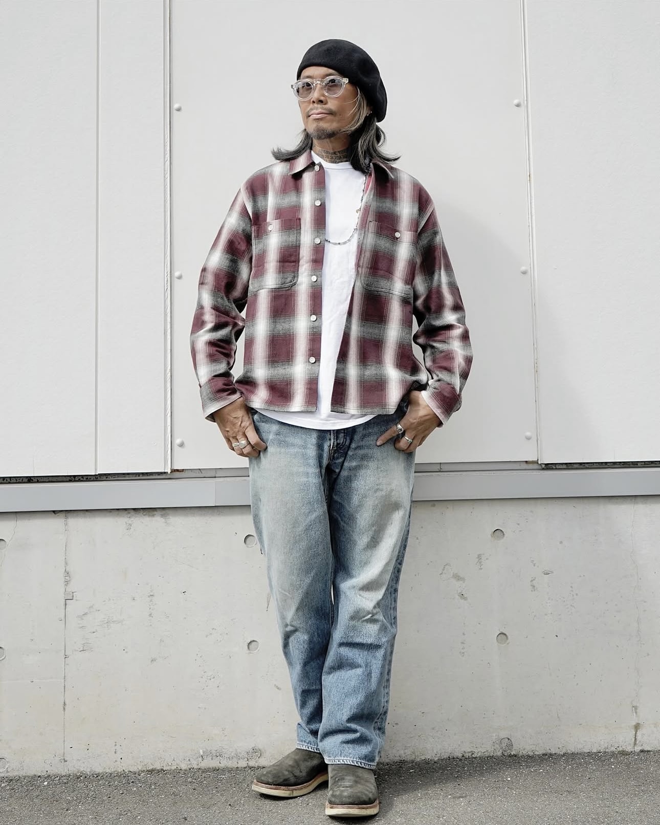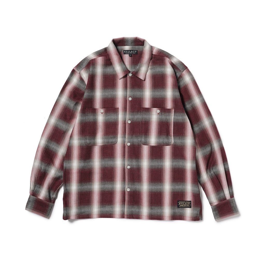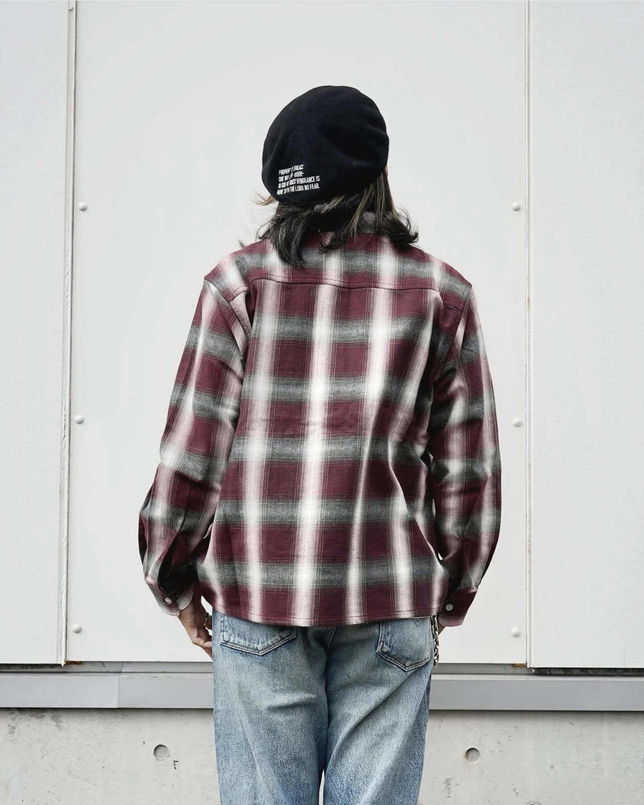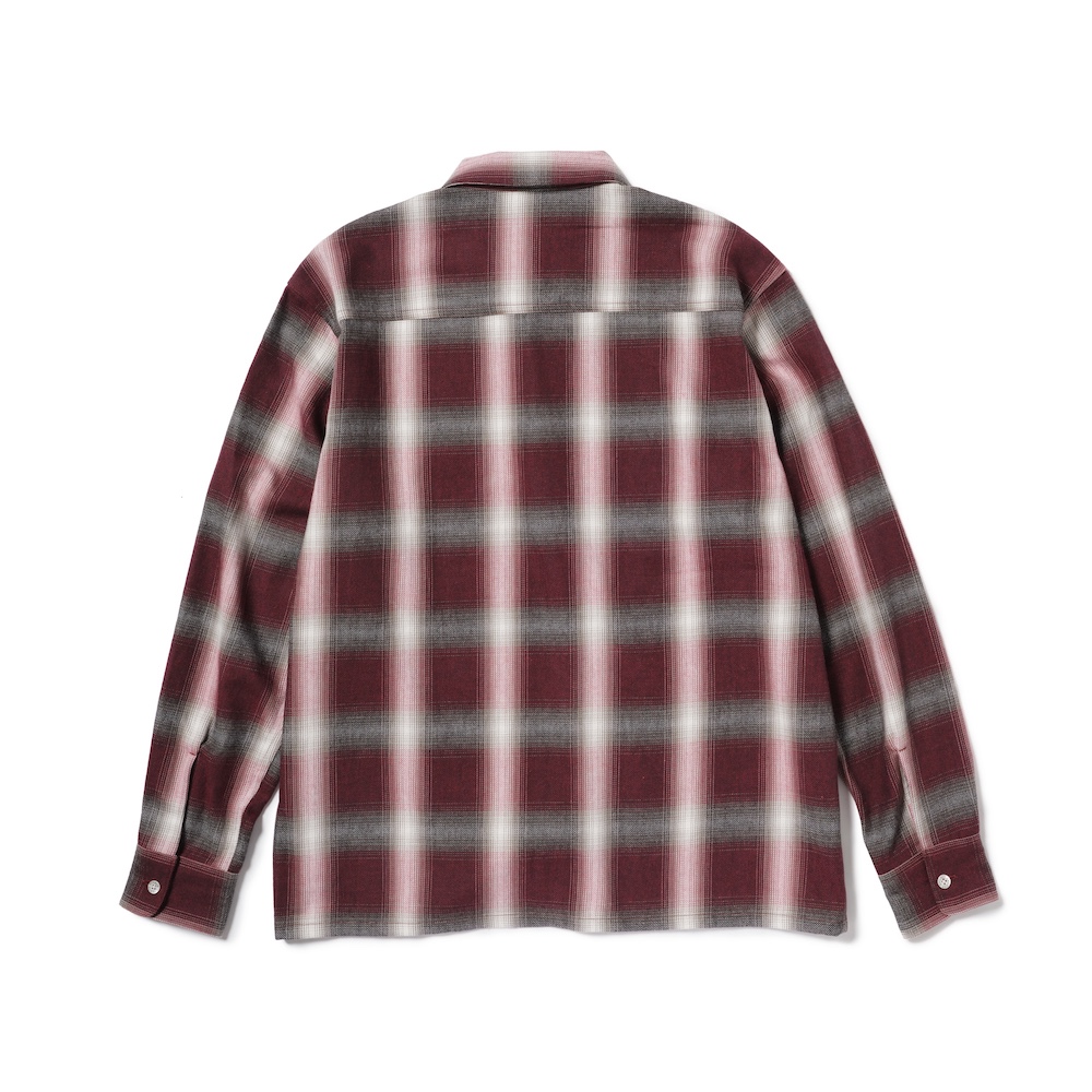 台襟を無くしたオープンカラーのパターンを使用する事により着用時のエリ周りが すっきりとしたデザインが特徴的なBOX型のチェックシャツ。