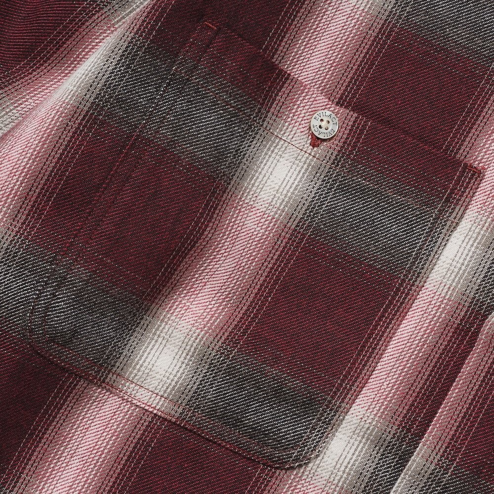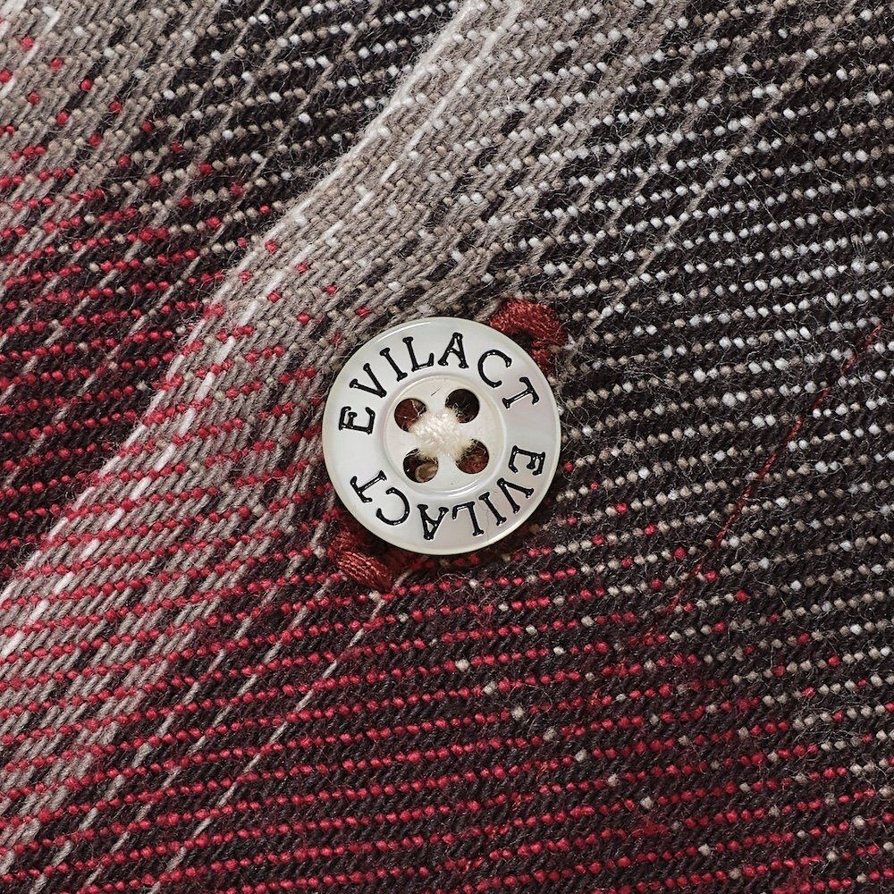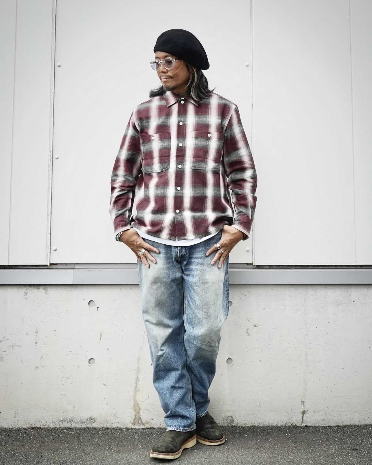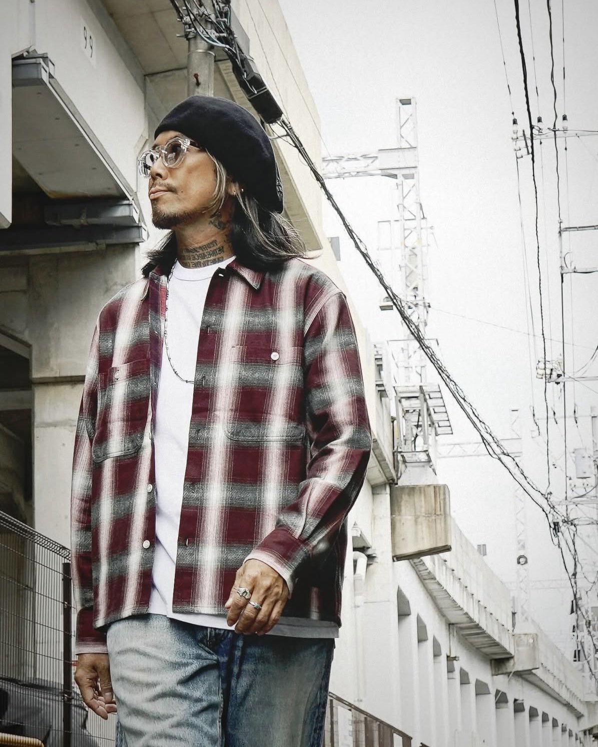 台襟を無くしたオープンカラーのパターンを使用する事により着用時のエリ周りが すっきりとしたデザインが特徴的なBOX型のチェックシャツ。