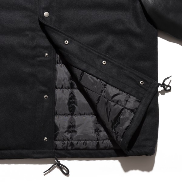 保温性が高いメルトン生地をメインに、袖やポケット口にはマットな質感のシンセティックレザーを採用したメルトンコーチジャケットです。