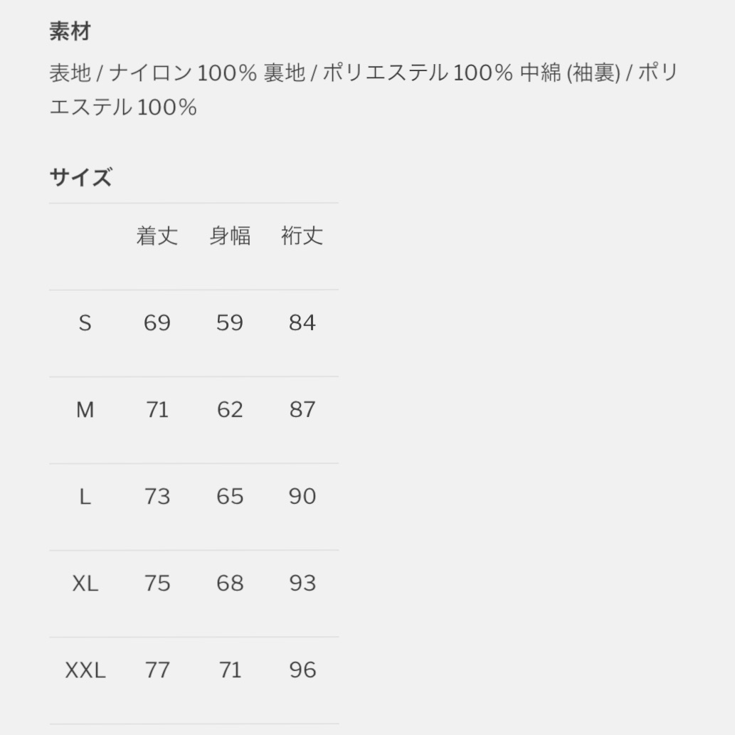 表地 / ナイロン 100% 裏地 / ポリエステル 100% 中綿 (袖裏) / ポリエステル 100%