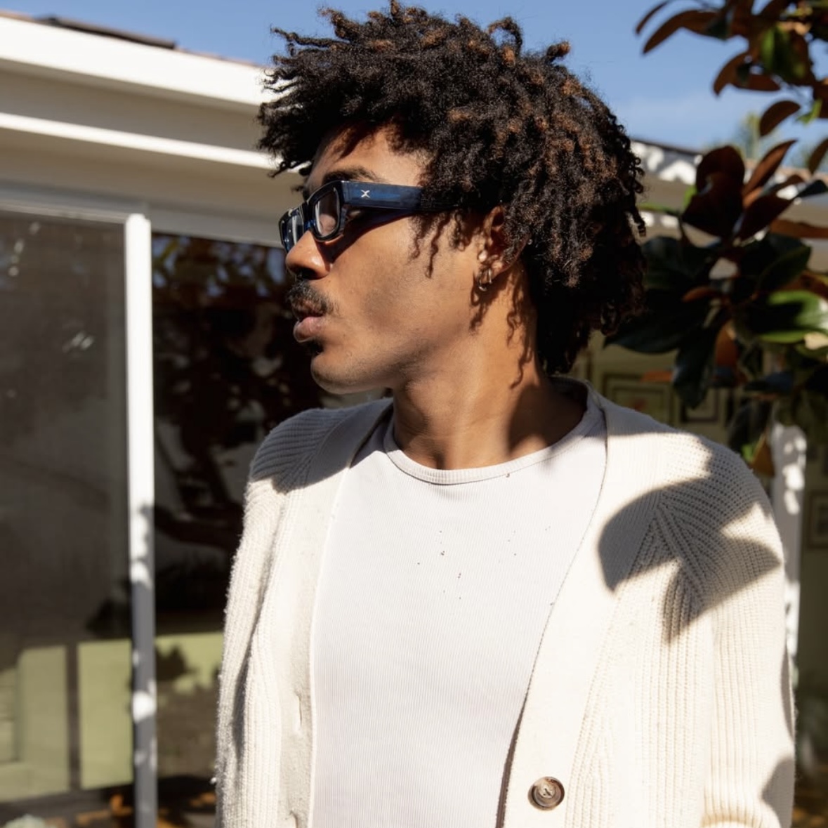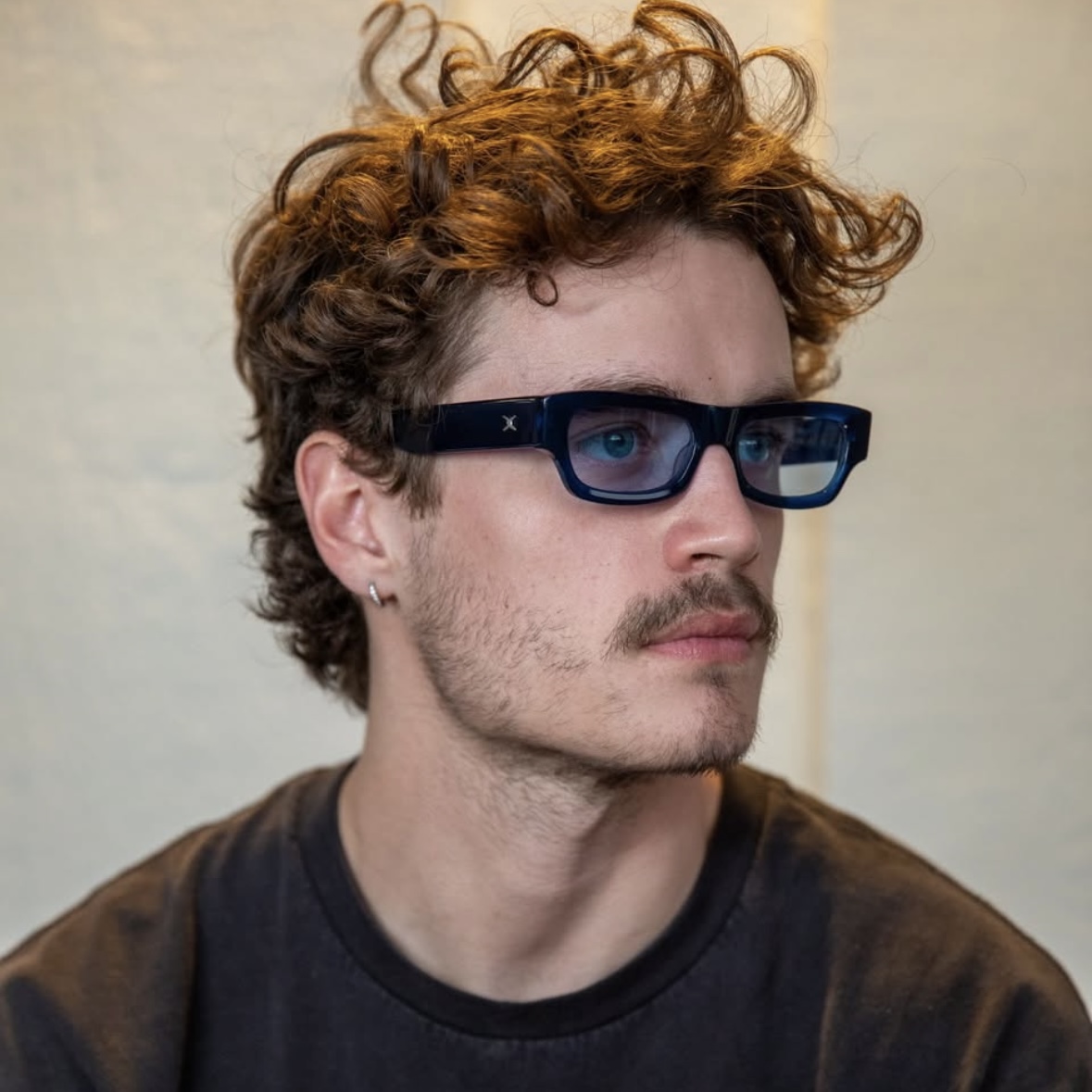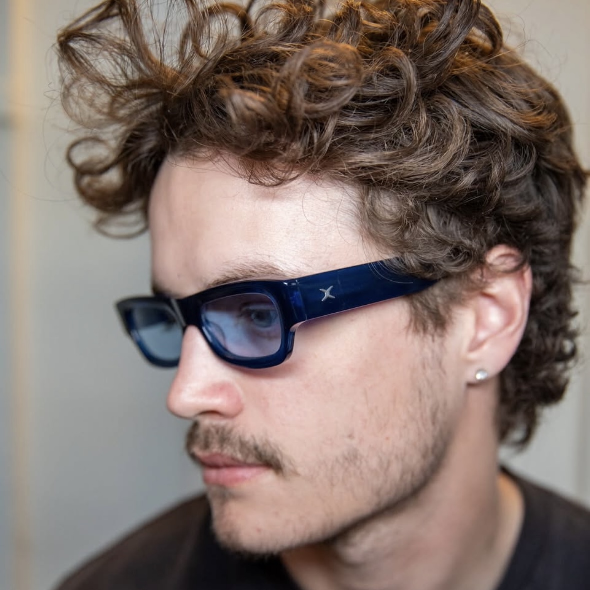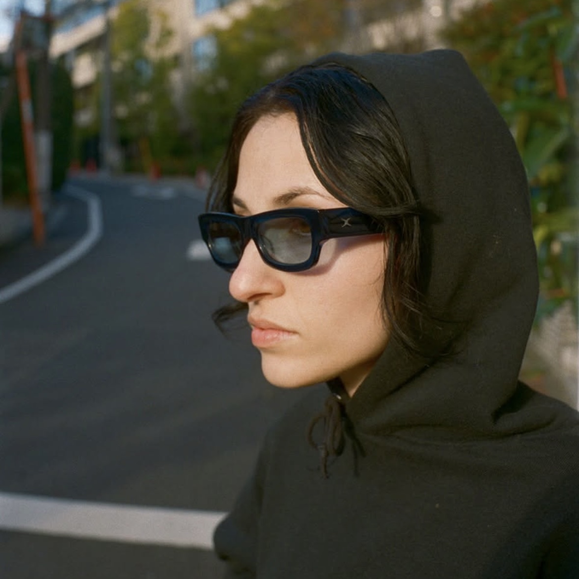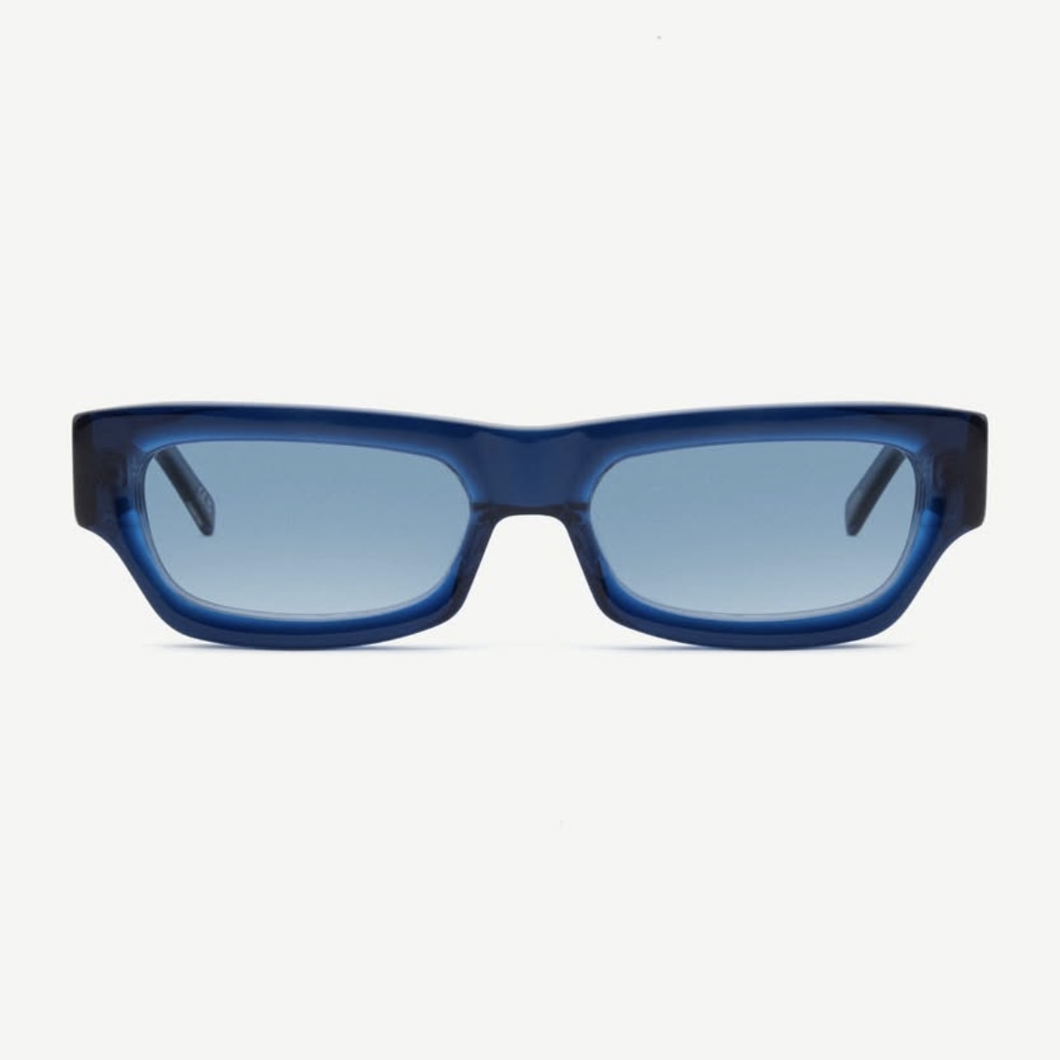 小さめのフレームに、フラットで角張ったフェイス、そして細身のレンズが特徴。