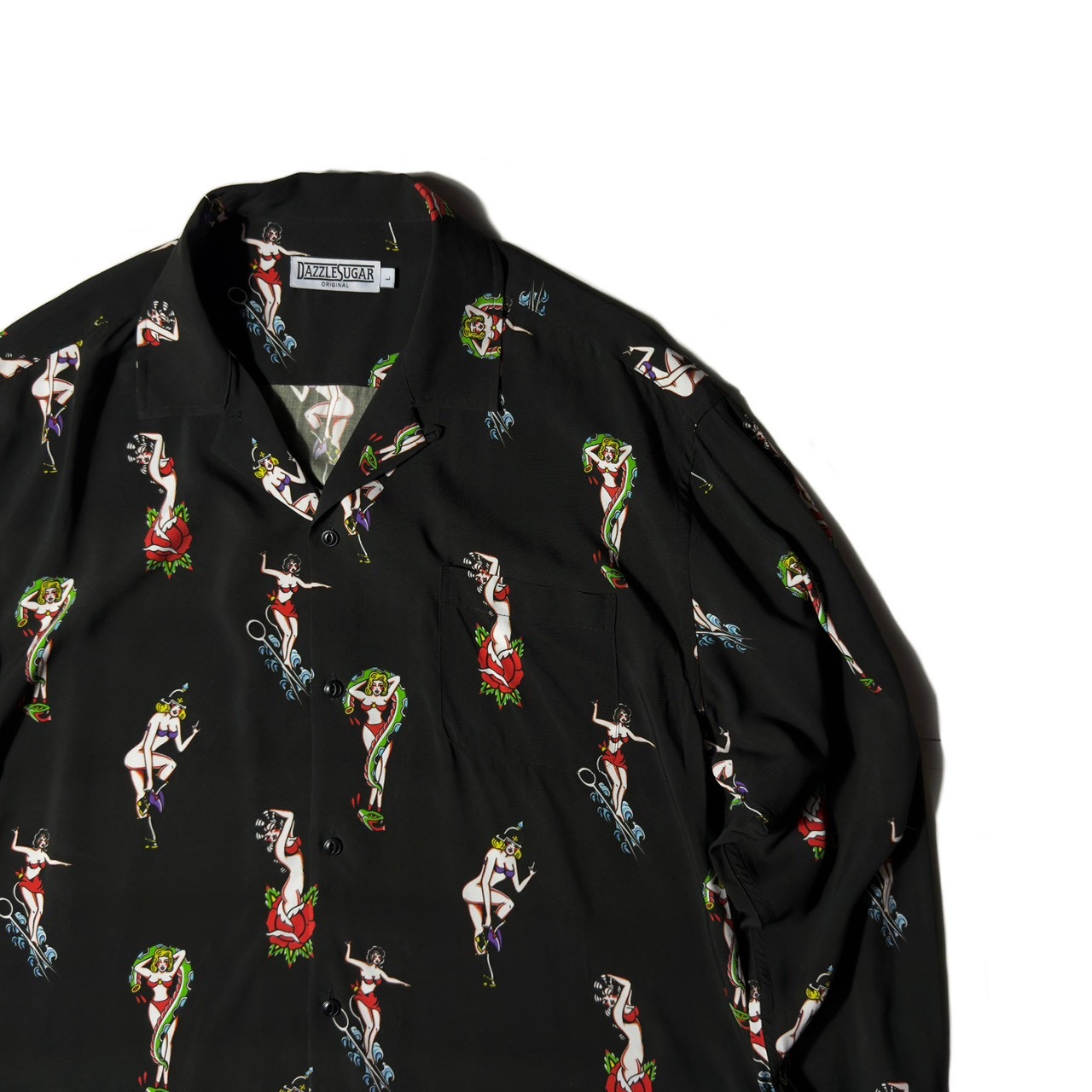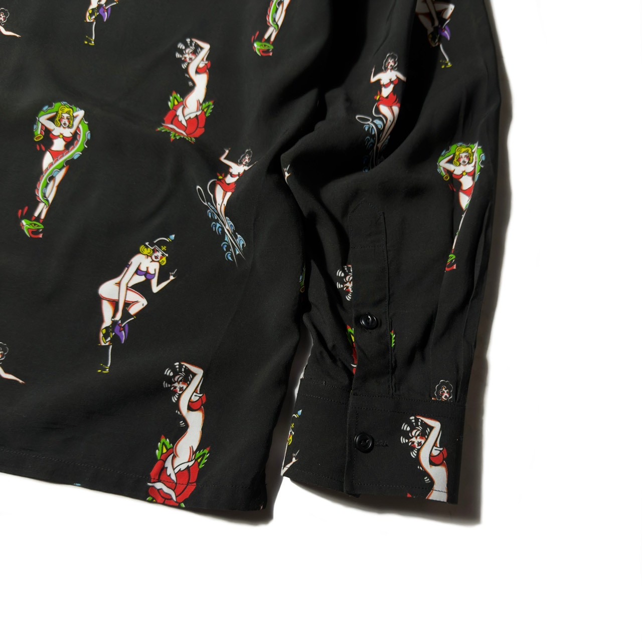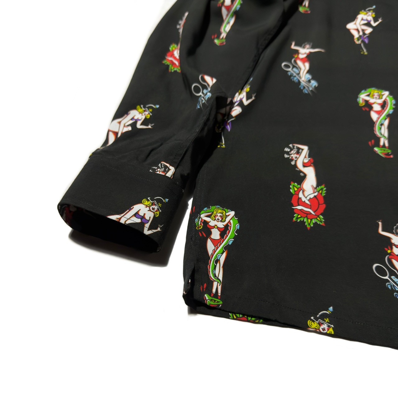 艶やかで妖艶なピンナップガールを全面に落とし込んだ総柄仕様。